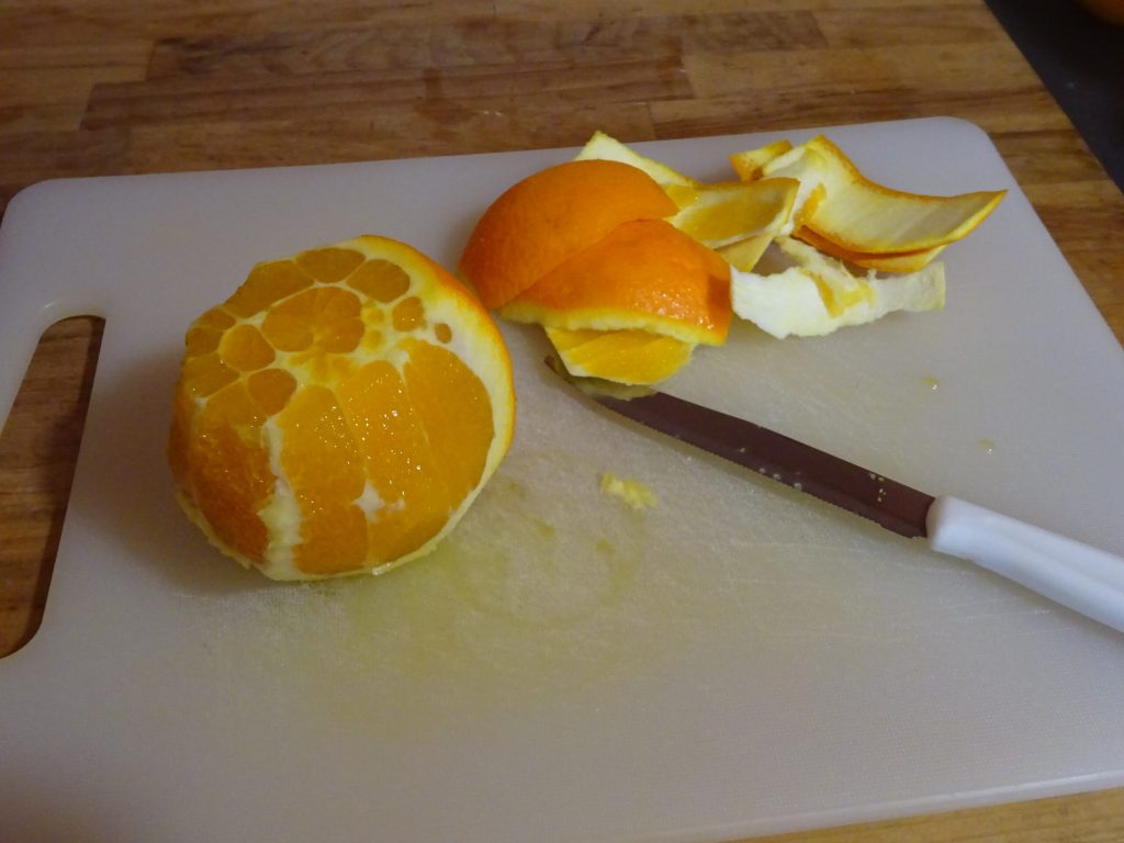 Peel the oranges to remove the white pith and then cut them into slices no thicker than half a centimeter.