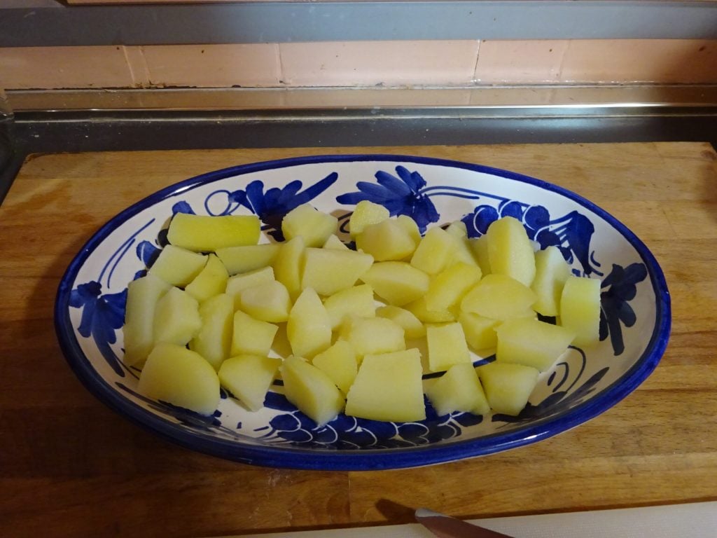 Cut the already boiled or steamed potatoes, cooled almost completely, into pieces about one and a half centimeters.
