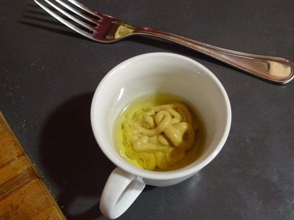 In a coffee cup, mix the olive oil, mustard, and 2 pinches of salt.