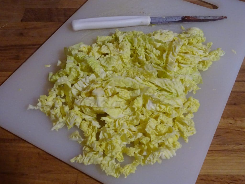 Clean, wash, and dry the cabbage well, then cut it into strips about a quarter inch thick.