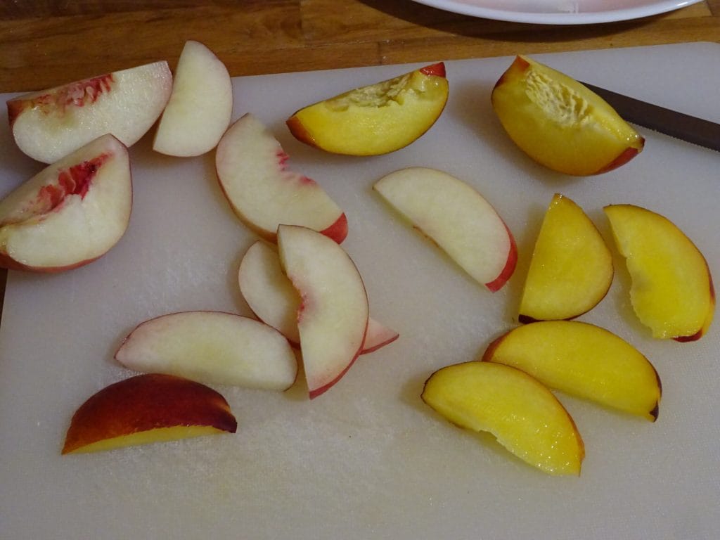 Now wash and pit the peaches, then cut them into wedges and finally into thin slices.