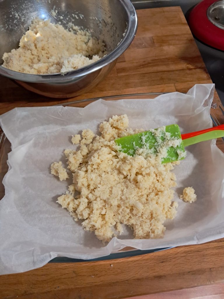 • Line a baking dish of about 7×12 inches with parchment paper, then pour the cocada mixture and level it well with a spatula.