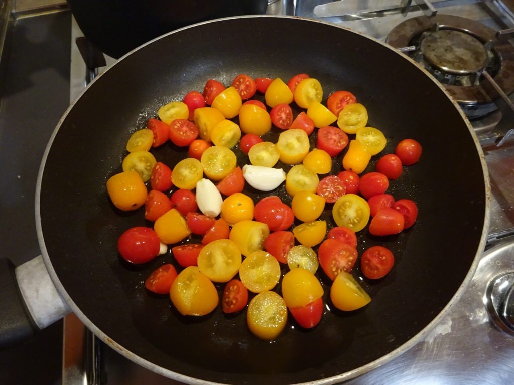 Now pour the oil into a large pan and add the garlic cloves. Let it flavor for 2-3 minutes, then add the halved cherry tomatoes. Cook for about 5 minutes over high heat.