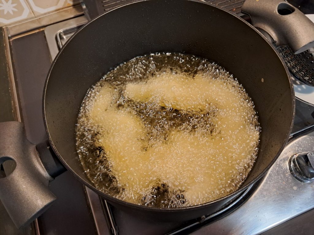 Now pour the oil into a large pot and bring it to temperature, about 356°F.