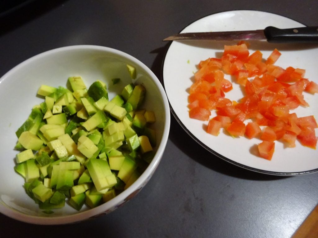 • Wash the tomato, remove the seeds, and cut the pulp into cubes. Add it to the avocado, slightly mashing it to have some whole pieces and some mashed.