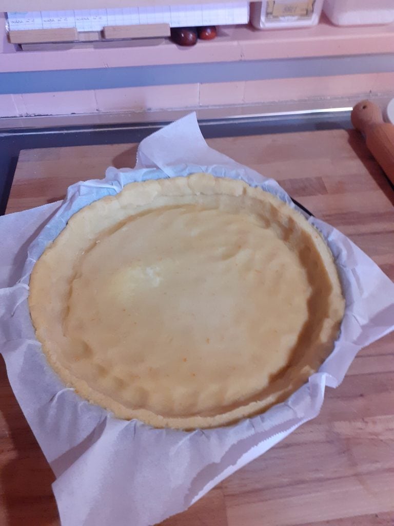 Once the shortcrust pastry is rolled out, remove the top sheet of parchment paper and transfer it to a tart mold of 10/11 inches.