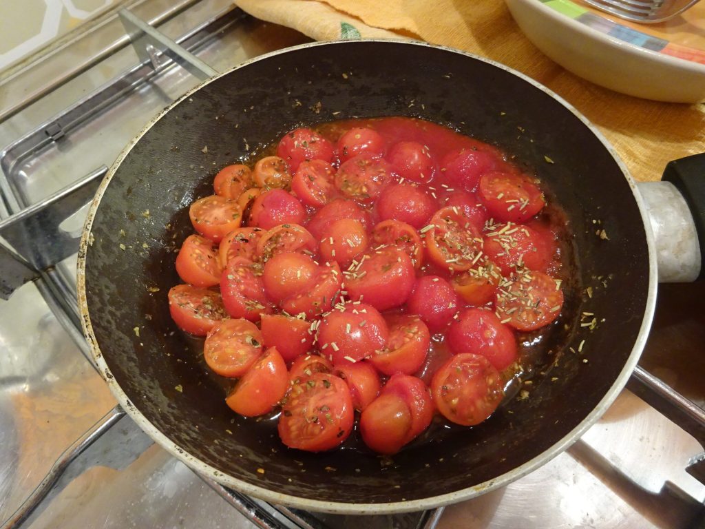 • After 5 minutes of cooking, add garlic, chopped rosemary, dried oregano, and a pinch of salt to the tomatoes.