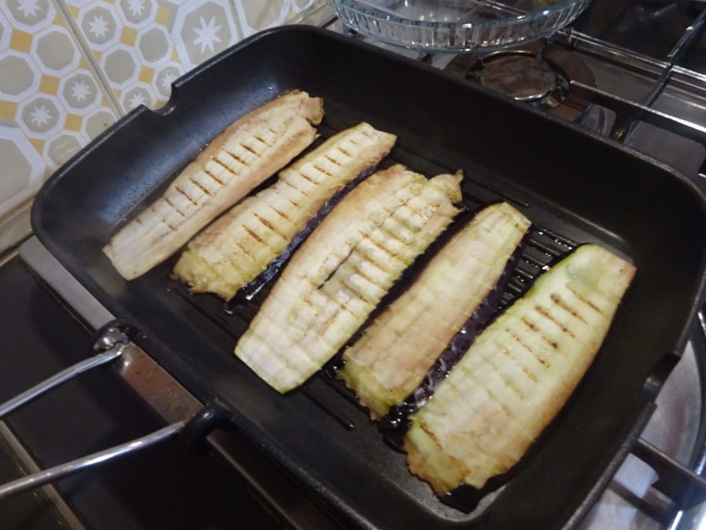 • Once sliced, lightly oil a grill, heat it up, and then start grilling the eggplant slices.