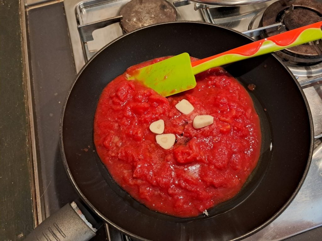 Pour the tomato pulp into a large skillet, add the olive oil and 2 cloves of garlic. Stir and cook for 7/8 minutes over medium-low heat with the lid on.