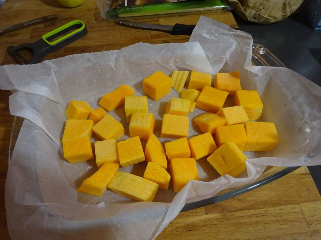 Cut the pumpkin into cubes and place it on a baking sheet or baking dish lined with parchment paper.