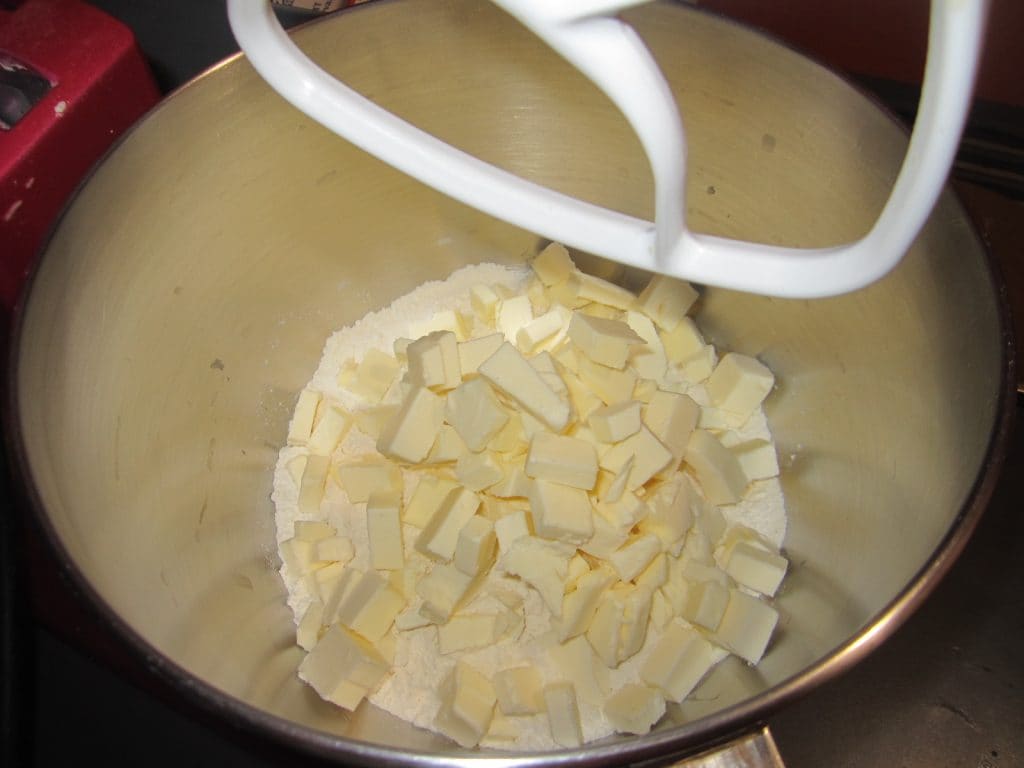 Pour the flour into the mixer bowl, then add the cold butter cut into pieces. Attach the paddle attachment and mix until you get a crumbly dough.