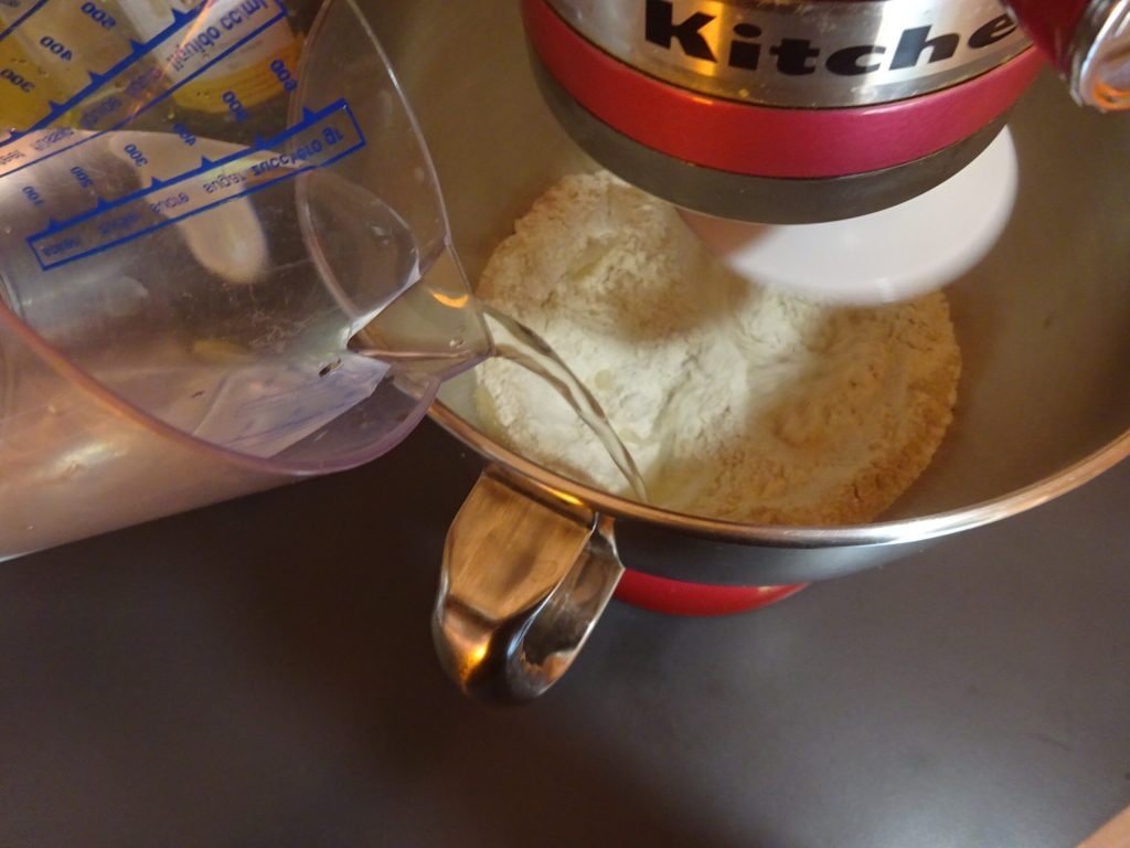 Start at medium speed and slowly pour in about 2/3 of the water. Mix until almost all the water is absorbed.