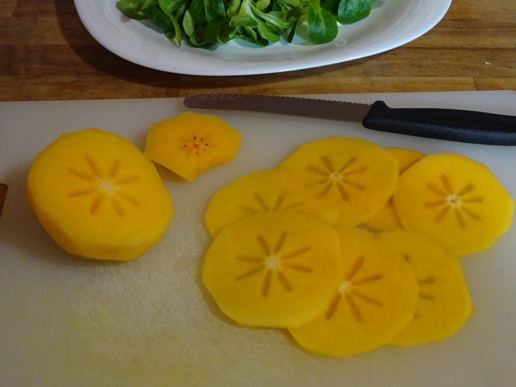 Now arrange the lamb’s lettuce on the plates and then add the persimmon slices.