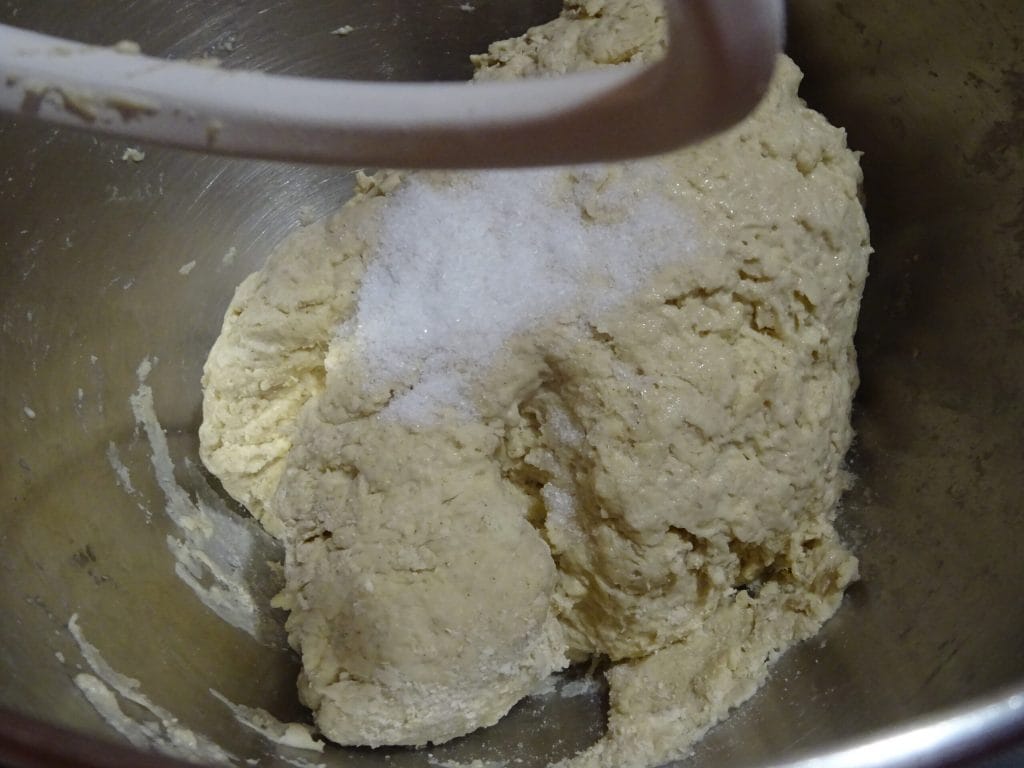Now stop the mixer, add the salt and the remaining water. Knead until you get a smooth and homogeneous dough.