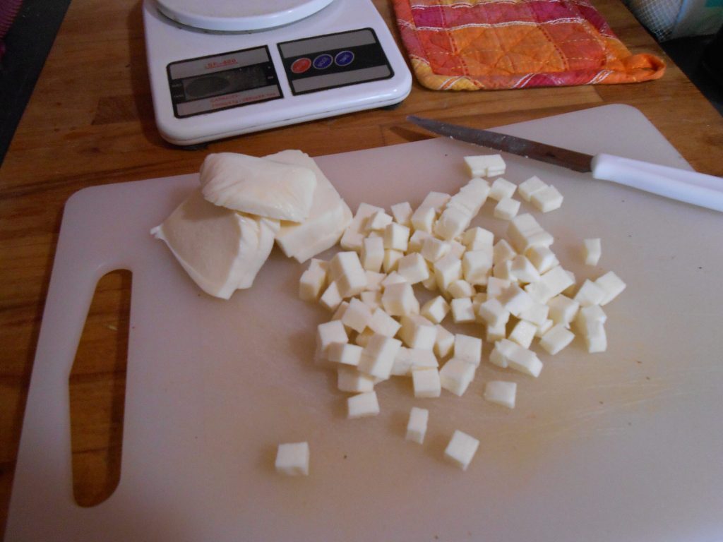 Meanwhile, cut the mozzarella into cubes, about the same size you cut the eggplants.