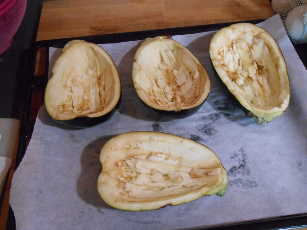 Place the eggplant shells on a baking tray lined with parchment paper and lightly salt them.