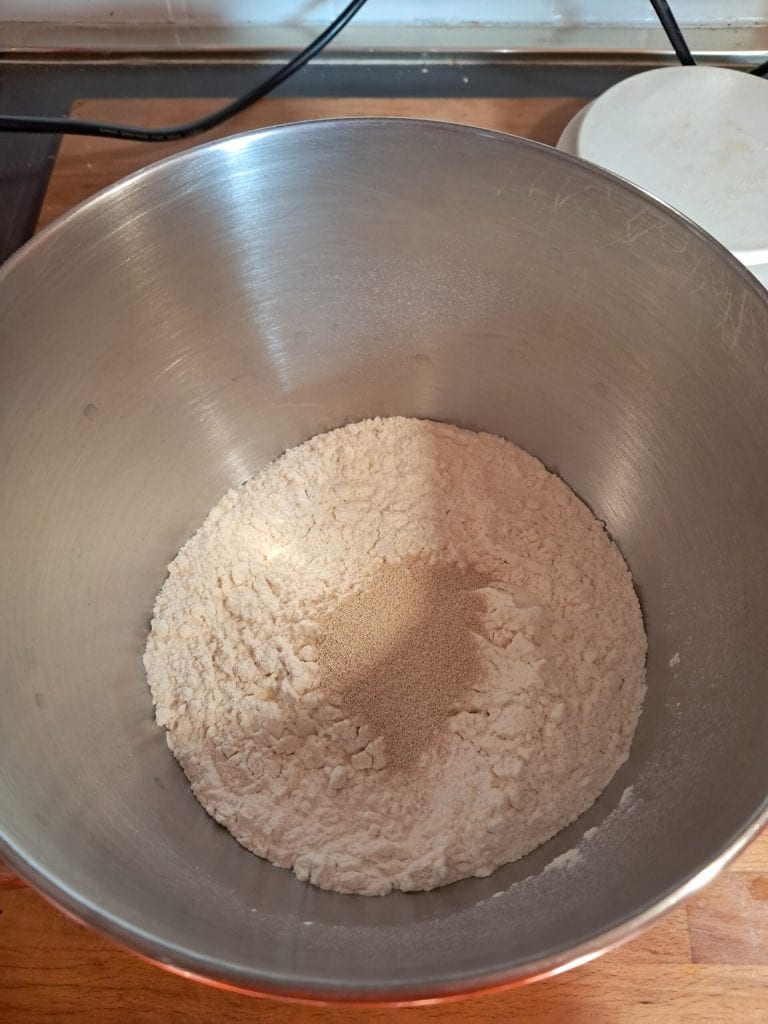 In the bowl of the stand mixer, pour the all-purpose flour and the active dry yeast.