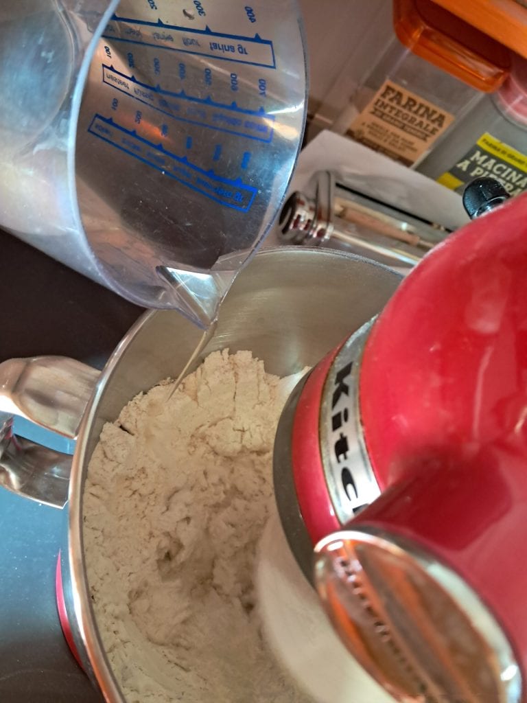 Start the mixer and add about 2/3 of the water available. Then work until the water is absorbed.