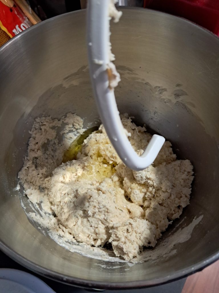 Remove the dough from the mixer and place it on a baking tray greased with 2 tablespoons of olive oil.