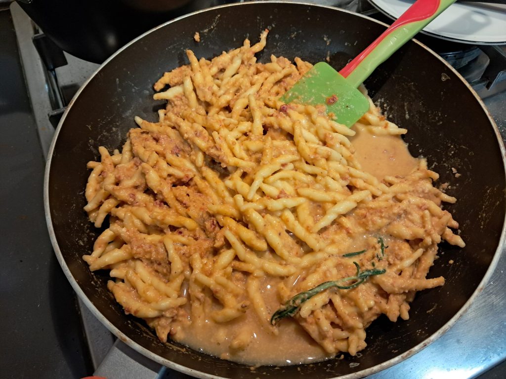 When the trofie are almost cooked, drain them directly into the pan with the sauce and stir to mix the sauce and pasta well.