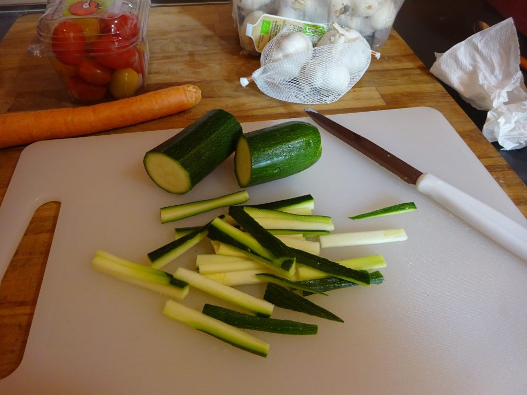 • After the 7 minutes of pasta cooking, add the chopped zucchini and