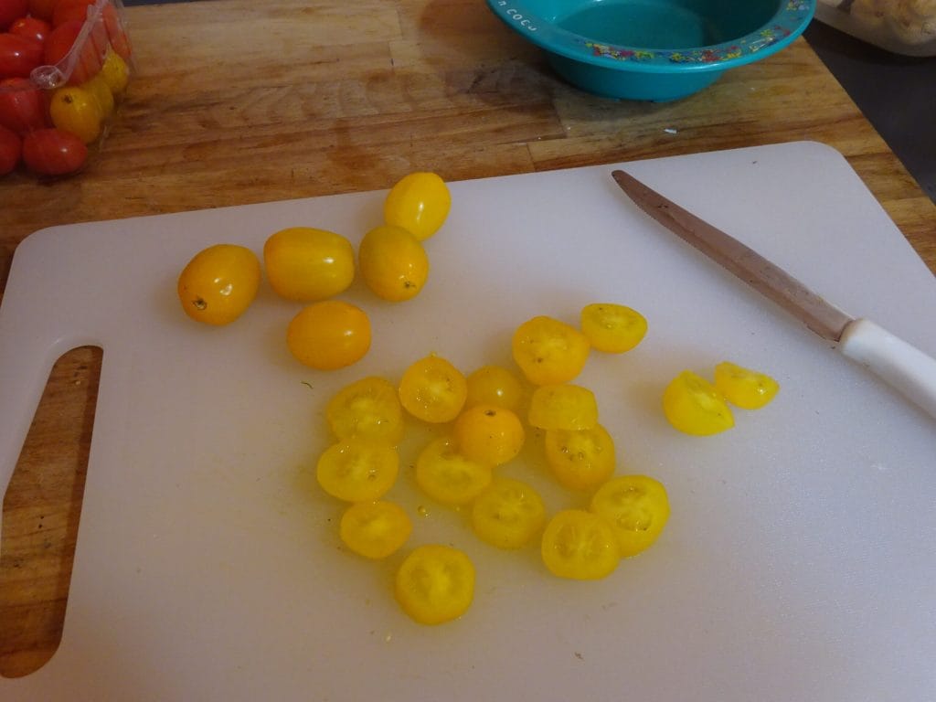 • …the yellow cherry tomatoes sliced into half-inch rounds.