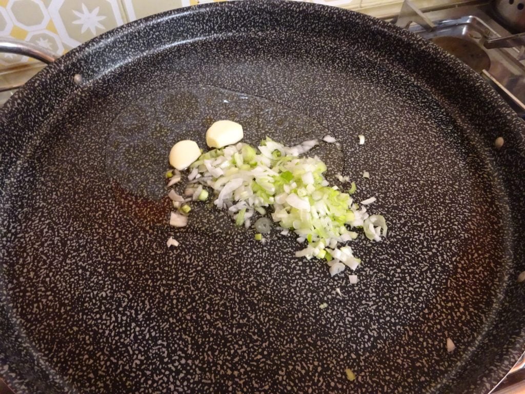 • Pour the olive oil into the paella pan and add the chopped scallion and 2 cloves of garlic.