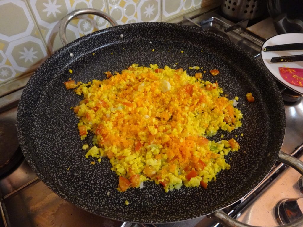 • Now add the tomato, carrot, and cauliflower to the sauté. Also add 1 packet of saffron and mix well to combine everything.