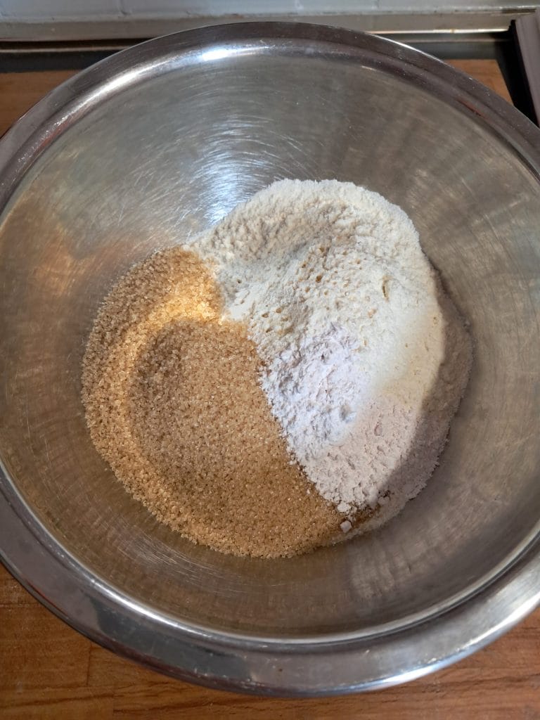 In a large bowl, pour the all-purpose flour, brown sugar, and packet of baking powder, and give a quick stir with a spoon to mix the powders.