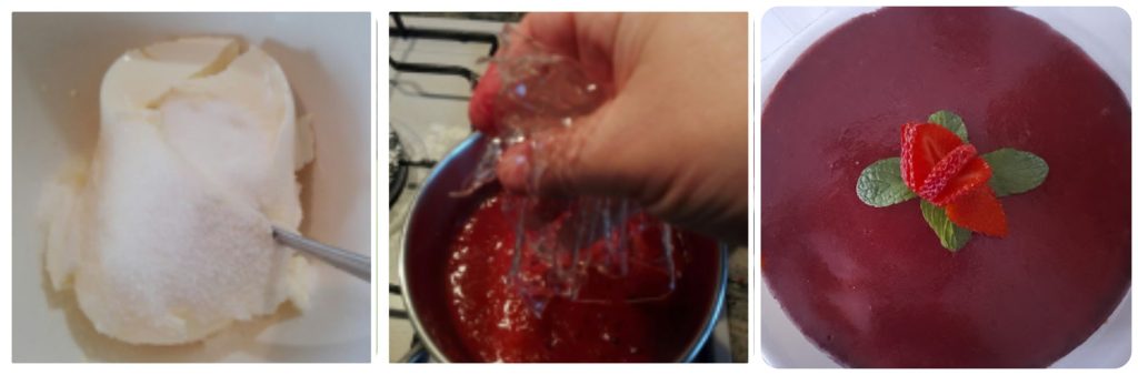 Wash the strawberries, chop them and cook them in a saucepan with the lemon juice and the granulated sugar, then purée everything. Press the purée through a fine mesh sieve to remove the seeds and obtain a very smooth gelatin. Soak another about 2 tsp of gelatin (approx. 3 gelatin sheets) for 10 minutes. Dissolve the drained gelatin into some of the warm strawberry purée (if the purée is cold, warm a portion to dissolve the gelatin, then combine everything). Let it cool but not set. Gently pour the strawberry layer over the already set cream.