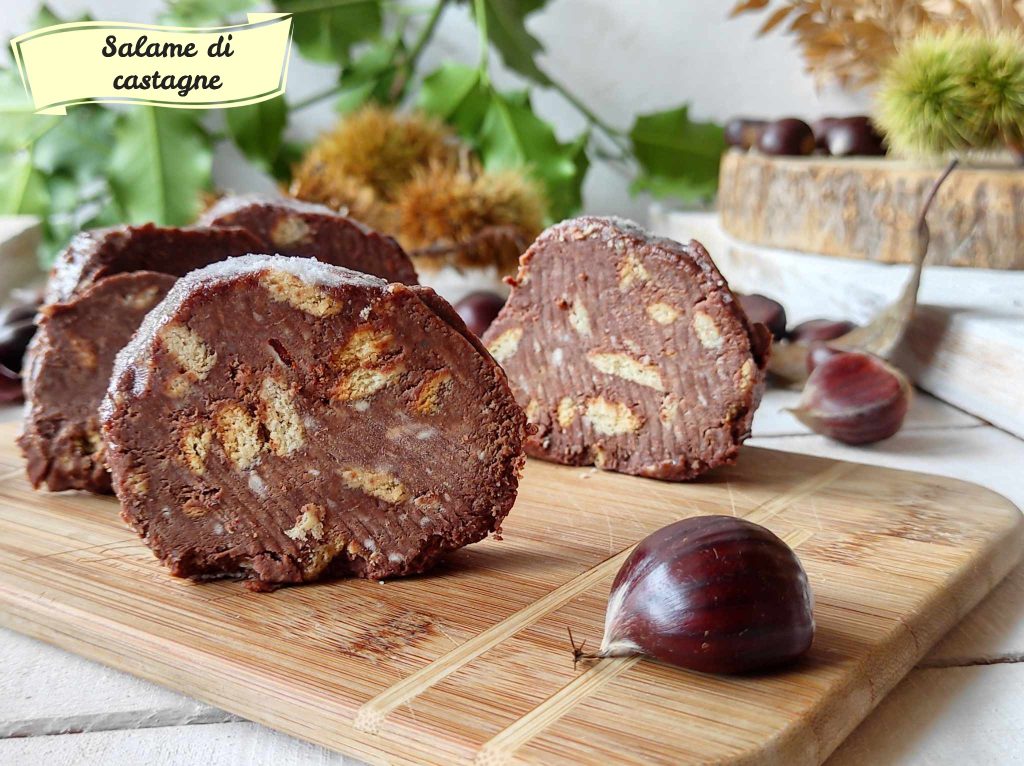 Chestnut Salami. Craving fall!!! What could be better than a fruit like chestnuts to prepare a delicious dessert. Today in our kitchen we have created another simple and quick dessert, yet impressive: chestnut salami. Chestnuts can be consumed boiled in salted water, or in a pressure cooker, for faster cooking that also preserves all properties, or cooked in special perforated pans to make the famous roasted chestnuts. They can also be the base for savory dishes, such as soups, stews (rice and chestnuts) and purees, or make a rich filling for ravioli, making them a very versatile ingredient in the kitchen. Chestnut Salami is a delightful dessert to prepare during the Autumn season, perhaps after a nice harvest with your children.