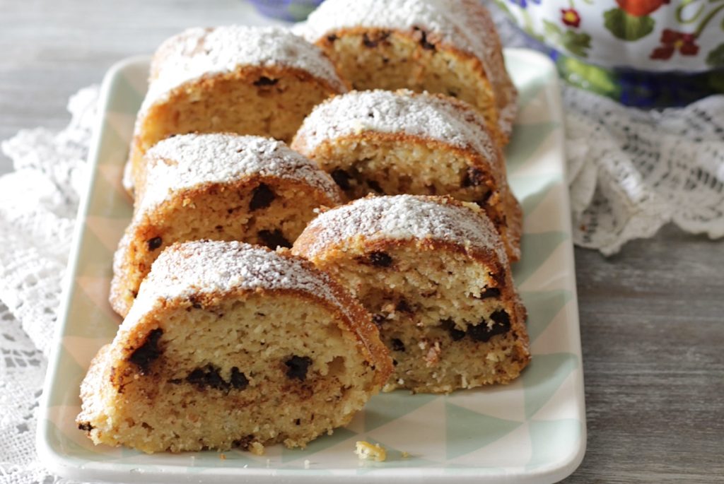 Once baked and un-molded, the APPLE BREAD WITH CHOCOLATE is cooled and sprinkled with powdered sugar.