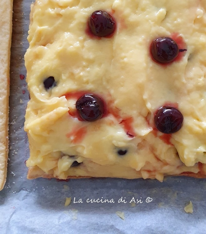 I also add the drained cherries (I could have done better) from the preservation syrup, arranging them randomly but trying to cover the entire size of the puff pastry uniformly.