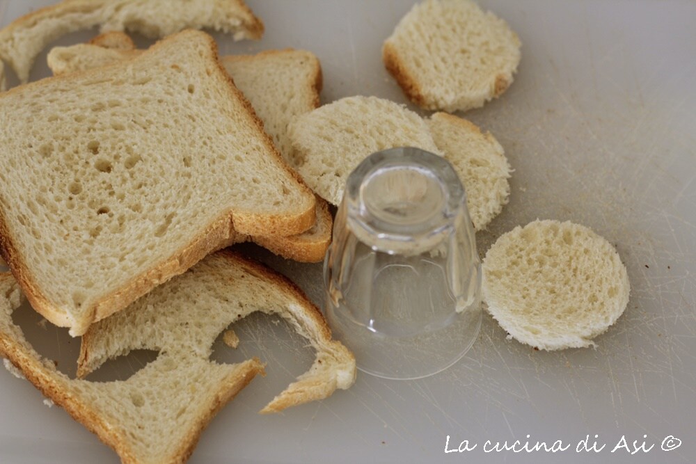 I cut circles from the slices of sandwich bread sandwiches or toast (plain bread without crust would be better, but I had this at home and I don’t like to waste food unnecessarily) of a few inches in diameter.