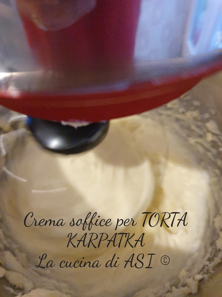 I finish the cream filling for the Polish Karpatka cake, now cold, by beating it with whisks or a stand mixer since it will have solidified, and