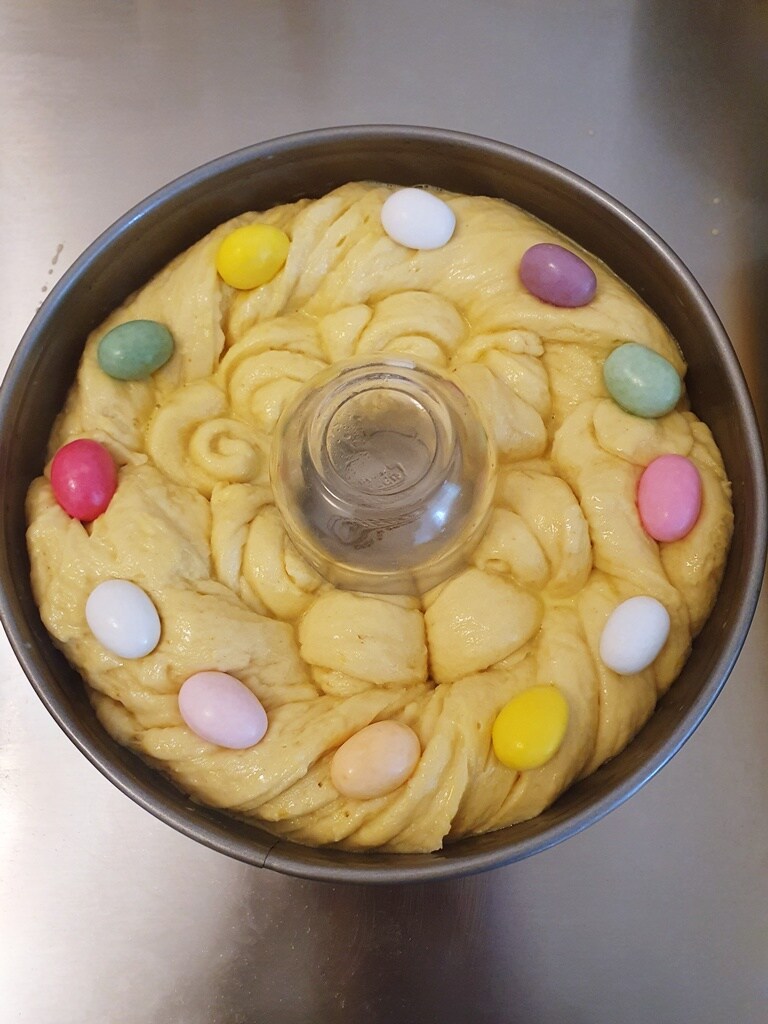 If someone has already read here on the blog, a while ago I remodeled the kitchen, and I’m still looking for the bundt pans, so… I put a well-greased glass in the center, of course, and set up my Easter wreath, brushing it with yolk beaten with milk.