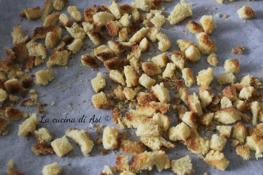 I cut the inside of the pandoro (which I had previously extracted to carve the star) into several uneven dice and I put them under the oven grill!