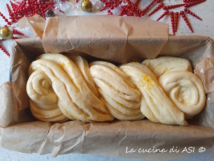 I brush with the remaining beaten egg mix with a bit of cream always left and cover with plastic wrap, letting this delicate orange-scented brioche rise again.