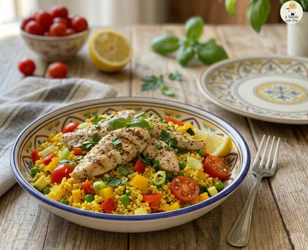 Chicken couscous with crunchy vegetables: the light recipe ideal for your packed lunch