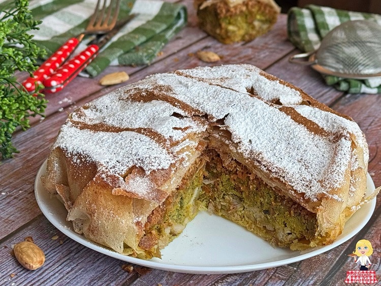 Indeed, thin layers of phyllo dough, light and crispy, envelop a rich and flavorful filling of tender chicken meat enriched by a velvety and slightly sweet sauce, obtained from the caramelization of onions and the addition of fresh eggs.