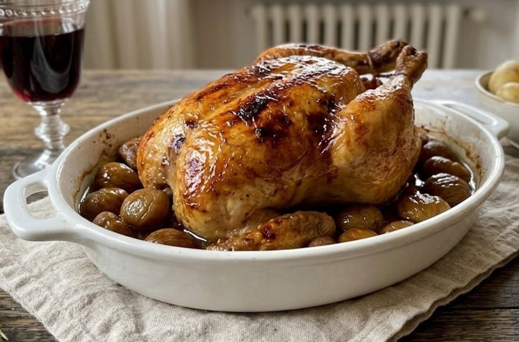 The trick is to seal in moisture. Roast the chicken at 356°F. If you notice the skin darkening too early (after about 40-50 minutes), cover it with a sheet of aluminum foil. Remove the foil only for the last 15-20 minutes to finish browning. Additionally, basting the chicken with cooking juices or the chestnut sauce helps maintain a humid environment in the oven.