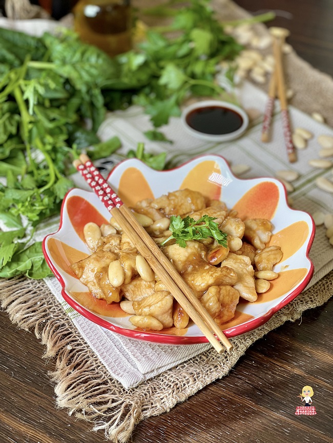 The original Chinese version would actually require, besides CHICKEN, ALMONDS and SOY SAUCE, other ingredients like bamboo shoots and rice wine and a long marination of the chicken, but since those elements are not always easy to find and I always have little time, I opted for this quicker ALMOND CHICKEN recipe that is no less delicious.