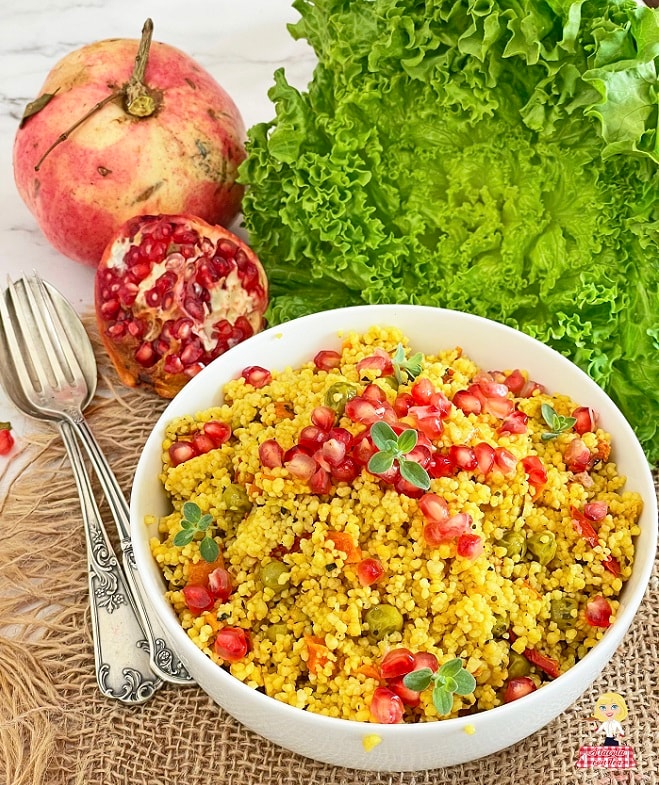 In today’s version (CHRISTMAS Cous Cous with Pomegranate seeds), we’ll prepare it in a simple way without proteins, which can be served as a side dish to a meat or fish dish or even eaten as a standalone vegetarian dish. What makes it special in appearance and taste are these wonderful red pomegranate seeds that give it an extra touch.