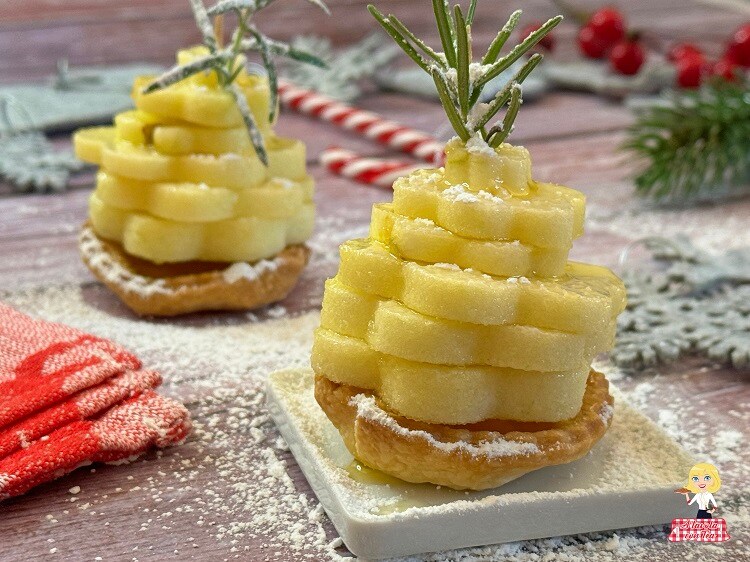 This sweet Christmas tree-shaped dessert is made with a base of ready-made puff pastry, the kind we find in the supermarket fridge section, cut into many circles that are then baked ‘blind’ (without filling) in the oven. Once the bases are baked, simply cut the apples into slices, use cookie cutters in the shape of flowers (or circles) in three different sizes, stack them on the baked puff pastry bases, decorate with rosemary sprigs, and sprinkle with powdered sugar to simulate snow.