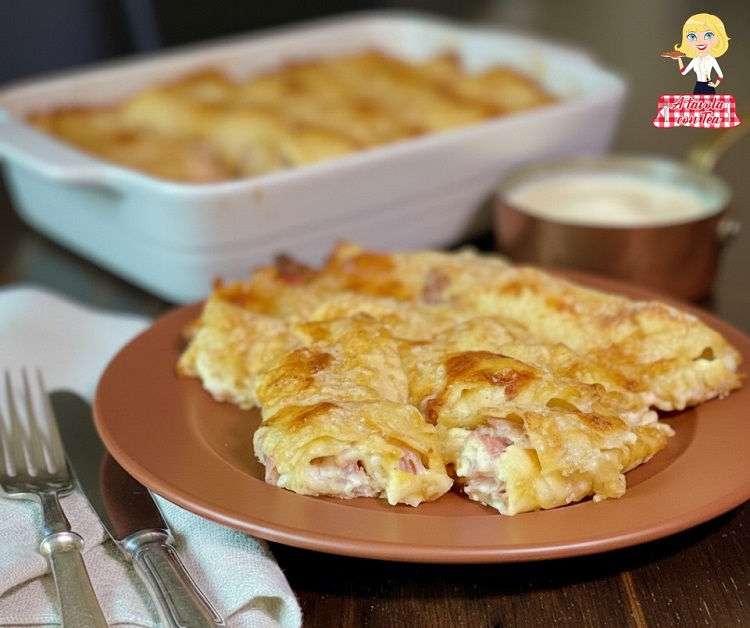 Baked cannelloni with ham and cheese made using crepes: a dish for Sunday lunch, for a special occasion but also for everyday.