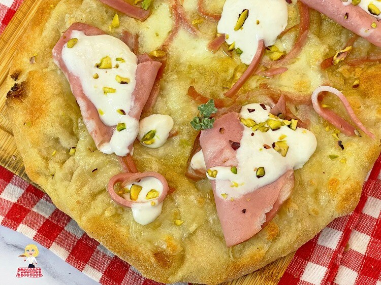 Today we will use a ready-made pinsa base (because that’s what I had in the fridge, but a wood-fired oven pizza base is also great) to prepare a delicious Pizza with Mortadella, burrata stracciatella, and pistachios, a ‘Bolognese’ version in the choice of topping that I preferred over others because I love mortadella and find that the creamy stracciatella and the savory crunch of pistachios pair perfectly.
