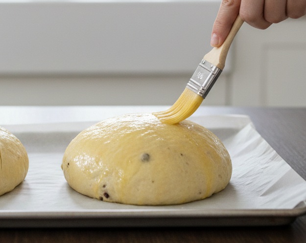 Brush the surface with the yolk-and-cream mixture, and score the top with a cross.