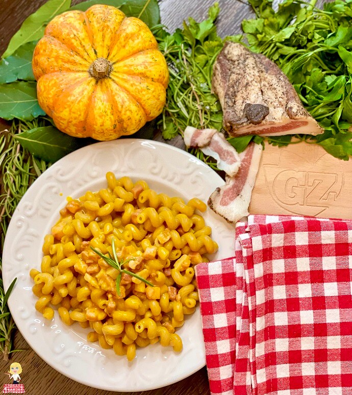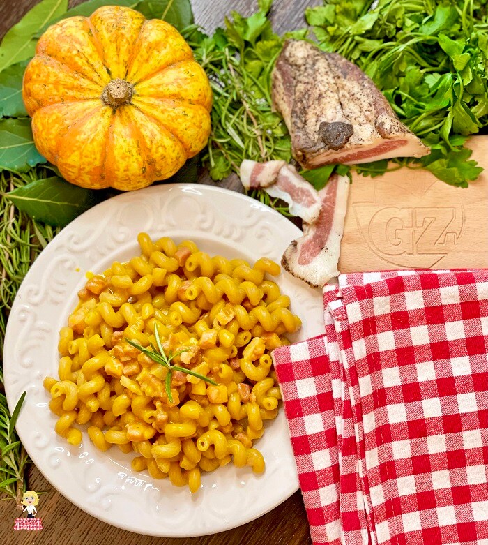 Pasta with pumpkin cream is a first course with a distinct flavor where the delicacy of pumpkin puree perfectly matches the bold flavor of pancetta.