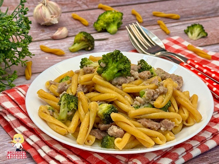 Easy and quick to make! In fact, to prepare the PASTA WITH SAUSAGE AND BROCCOLI, simply cut the broccoli into florets and blanch them in salted water for a few minutes. Meanwhile, sauté the sausage in a pan with a drizzle of oil and a clove of garlic and let it flavor. Once the florets are ready, simply pour them into the pan with the sausage, give it a quick stir, and the sauce is ready!