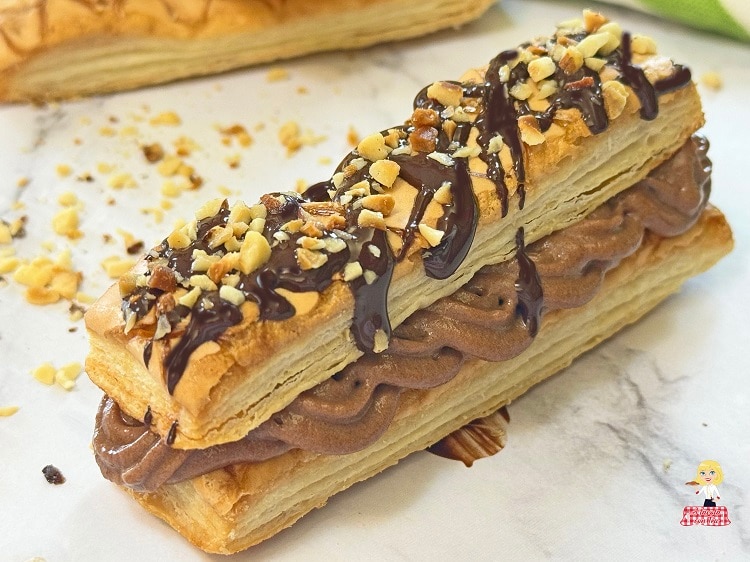 Two layers of crispy and golden puff pastry alternated with a luscious nutella and mascarpone cream, all enriched with hazelnut crumble, a sort of mini Millefeuille to eat in one bite.